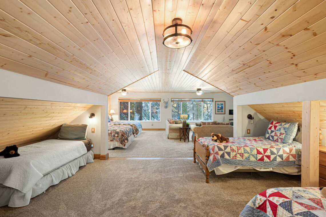 Upstairs is a giant sleeping loft with six beds: two queens, three twins, and one tucked away king. Parents love the separation, and kids love the sense of adventure.