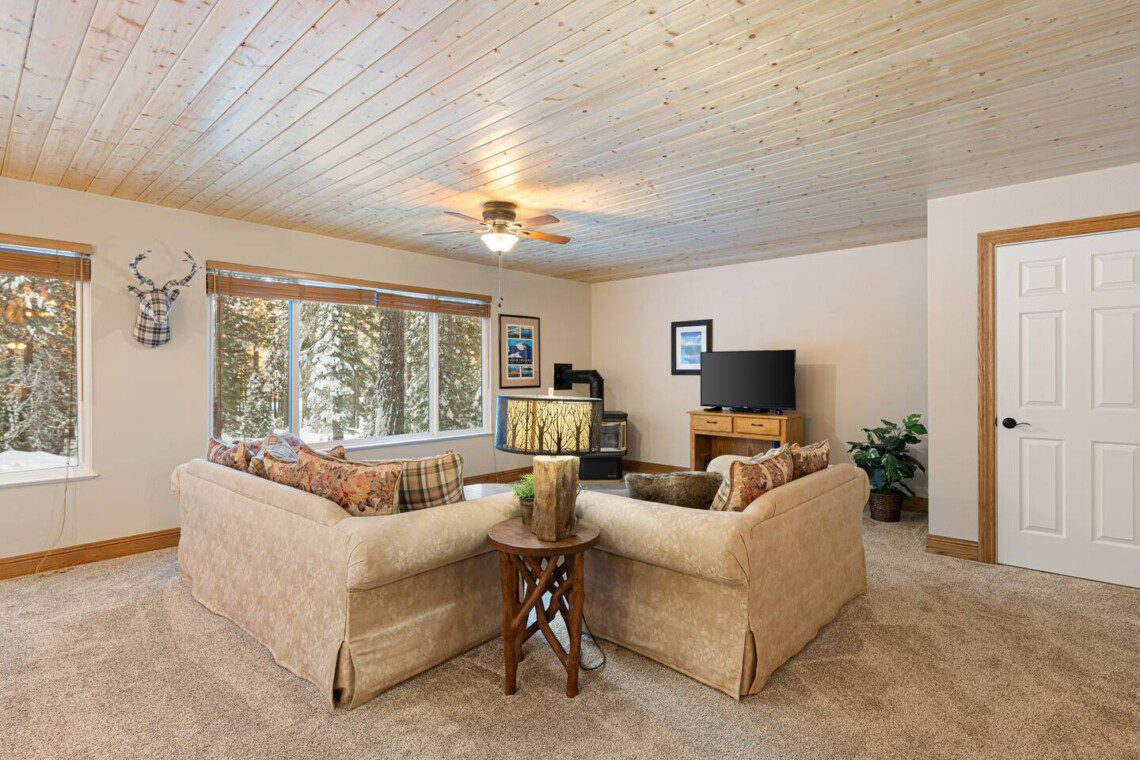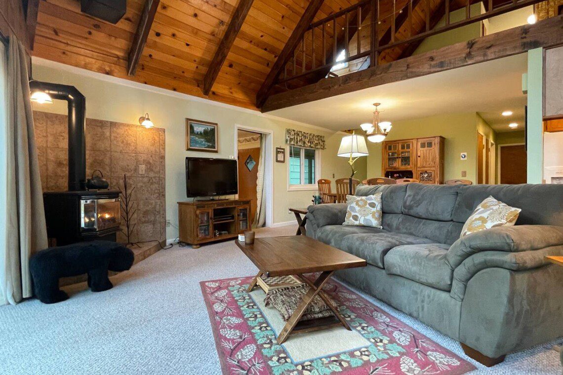 Relax beneath soaring pine ceilings while the gas stove warms the space. Guests love the cozy lounge, Roku TV, and thoughtful extras like games and classic movies. The perfect place to unwind after a day exploring Lassen.