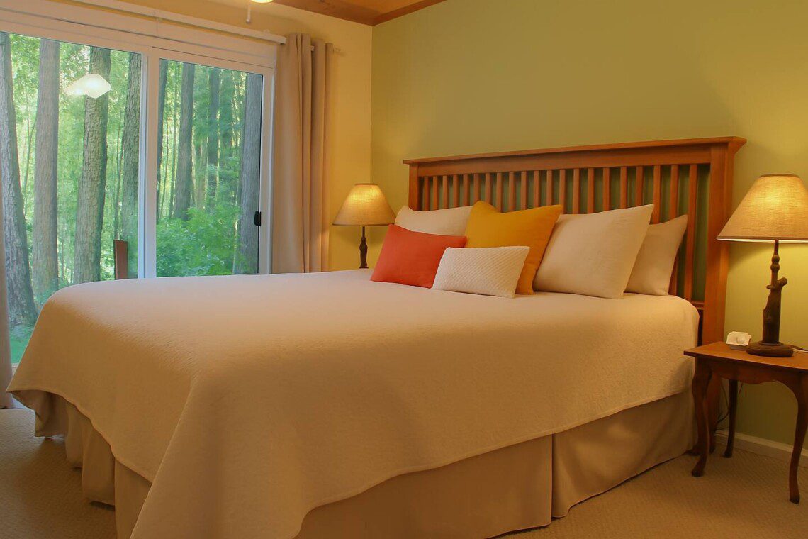 The upstairs king bedroom includes wraparound windows, a private balcony, upright piano and a dedicated desk for remote work. With Starlink WiFi, you can check email while surrounded by trees.