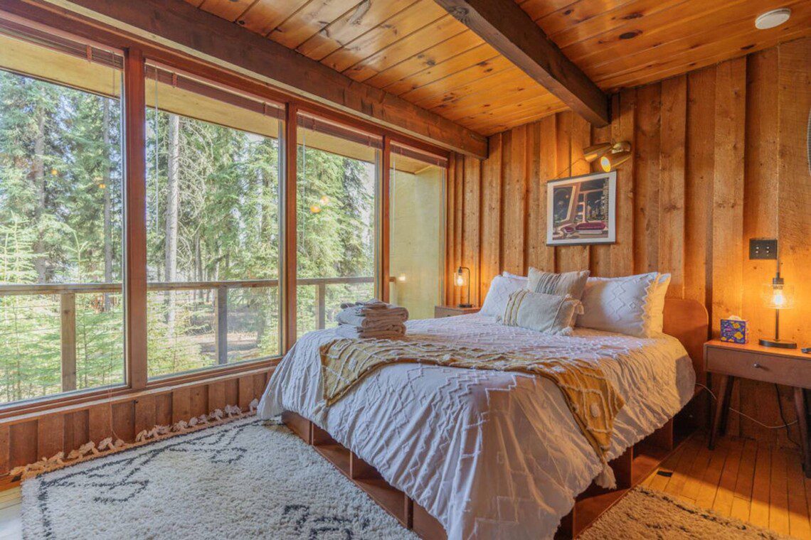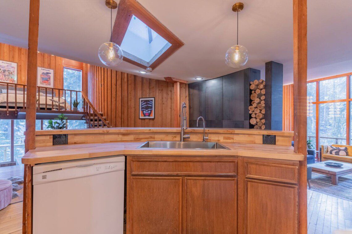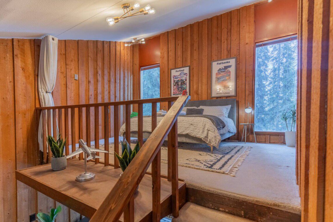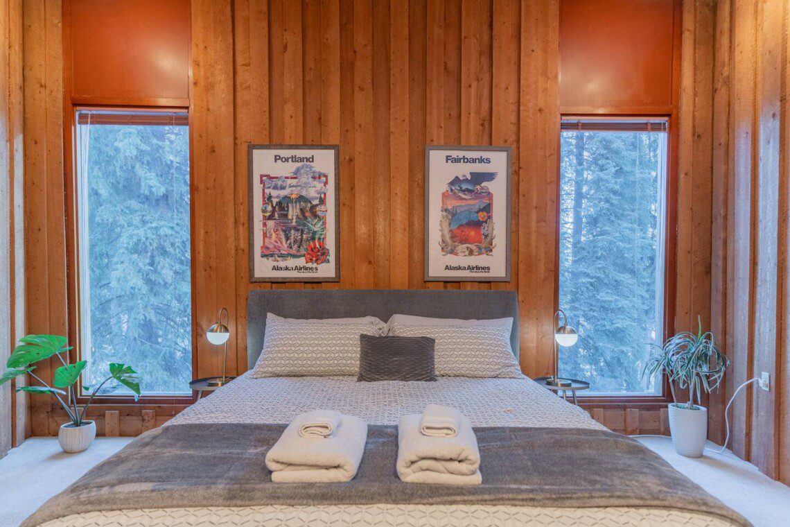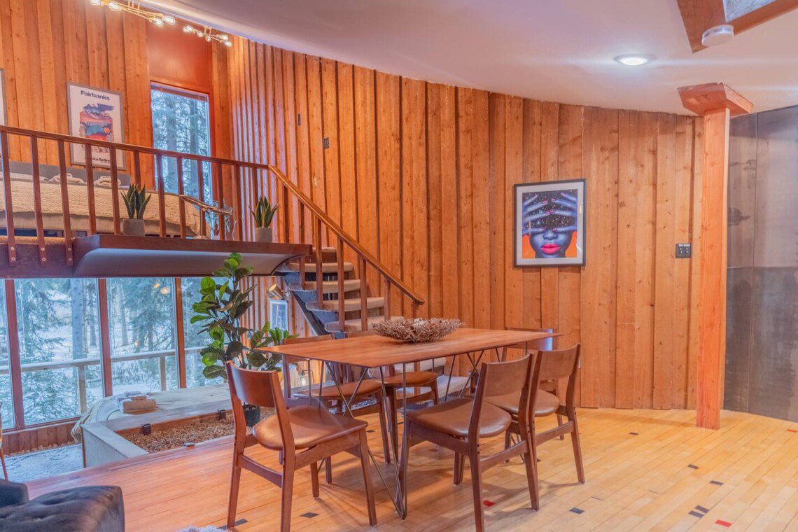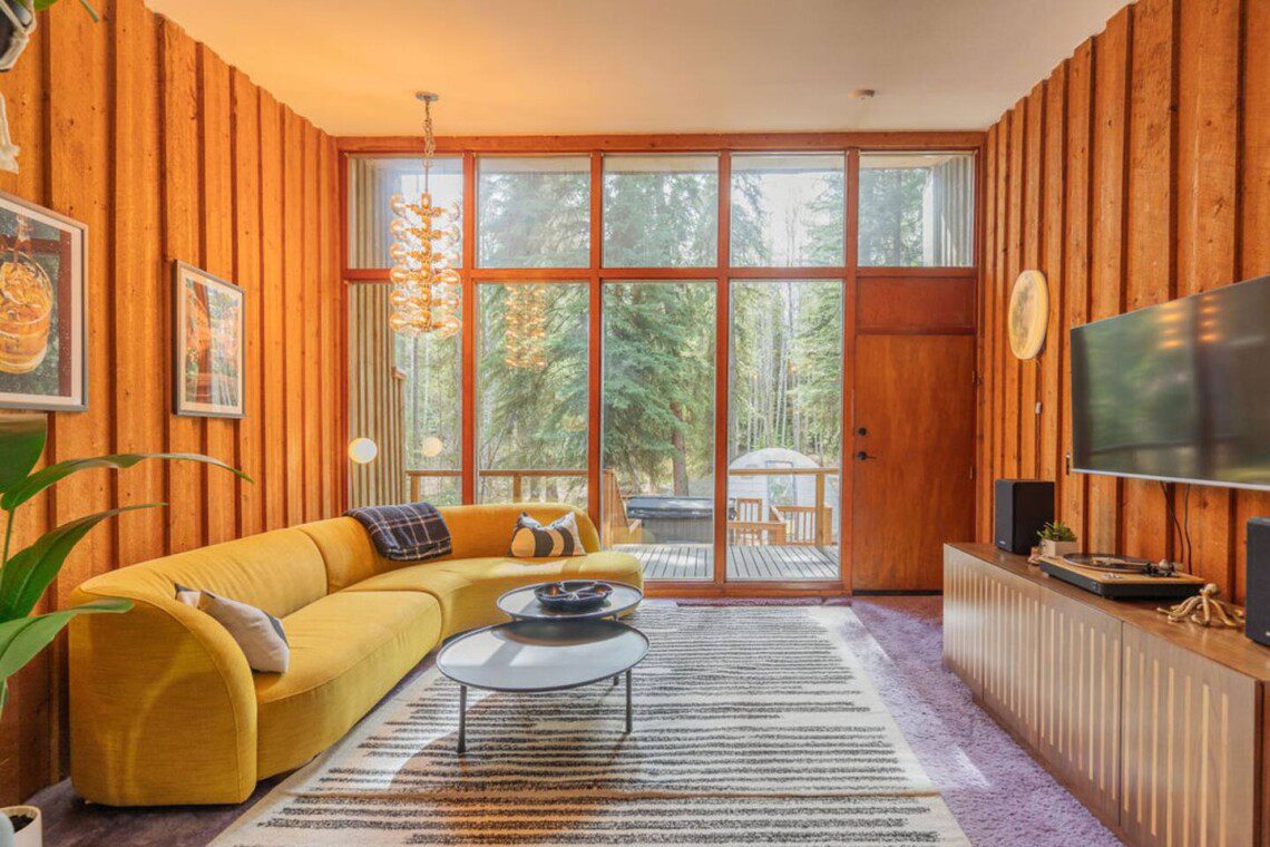 Upon entry, you’ll be greeted by the warm wood accents and soaring ceilings that define our spacious open living plan. The sunken living room, featuring expansive floor-to-ceiling windows accommodating nine guests, provides an unparalleled vantage point for experiencing the enchanting Aurora Borealis. Relax on our chic West Elm sectional couch while basking in the glow of a double-sided gas fireplace, creating a cozy atmosphere. Set the mood with your favorite tunes on our vintage record player or engage in a delightful game night for an authentic mid-century modern experience!