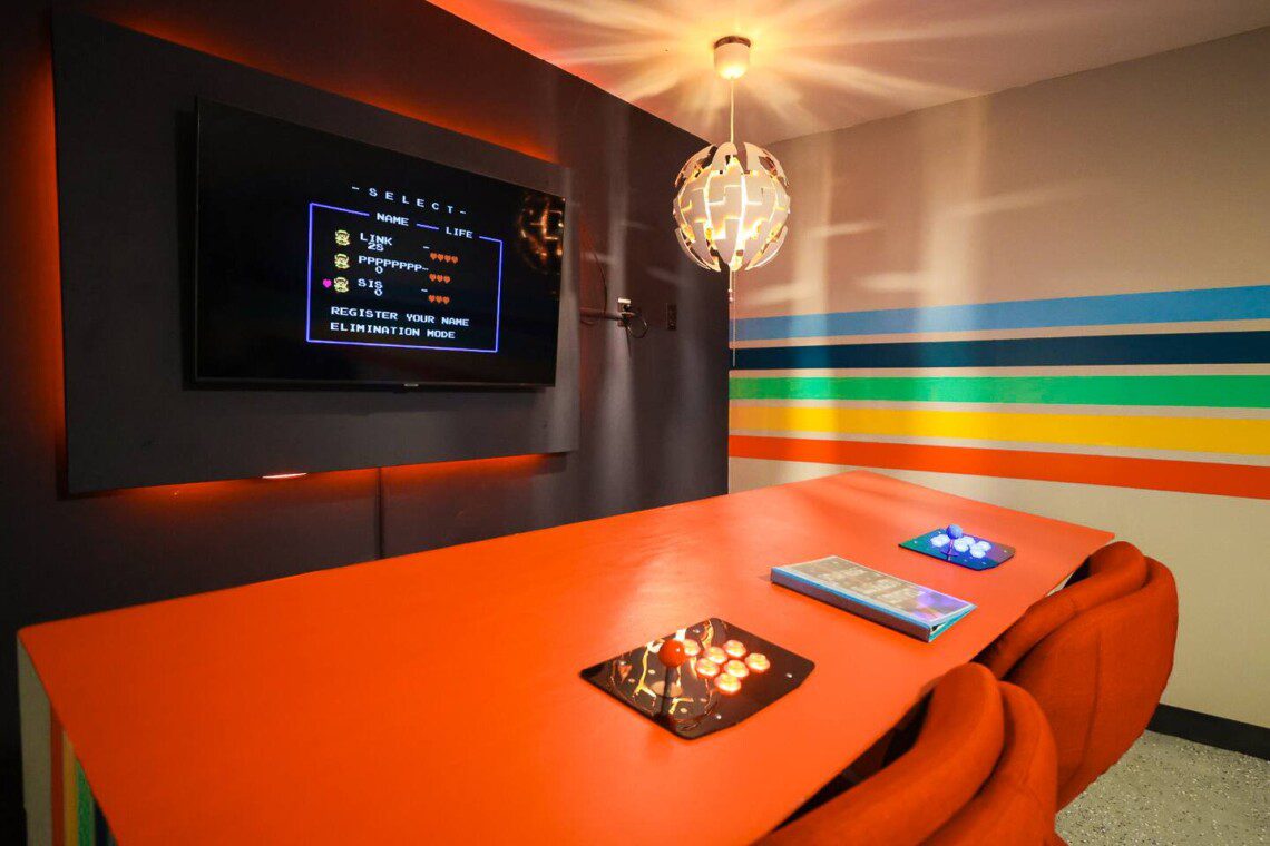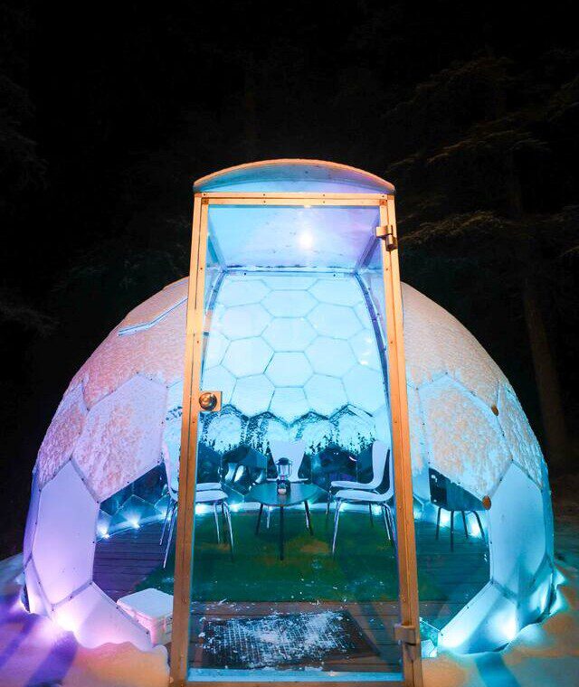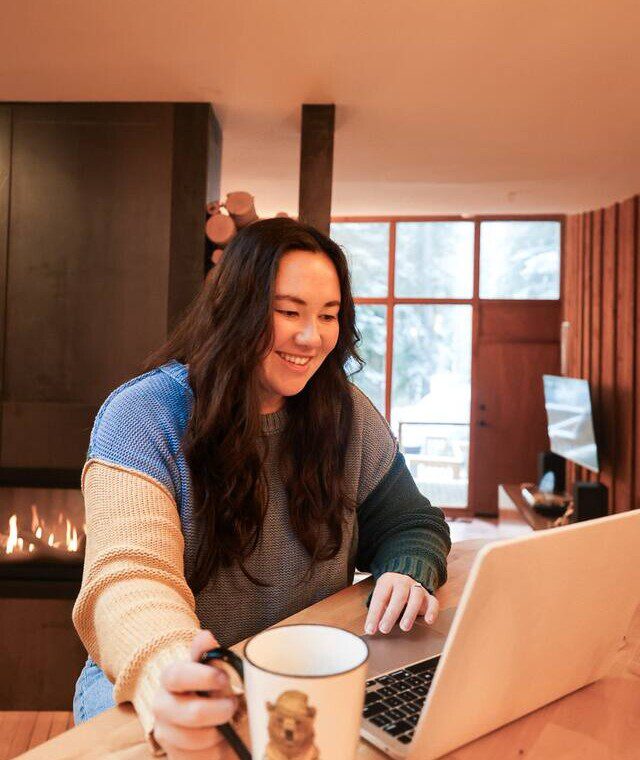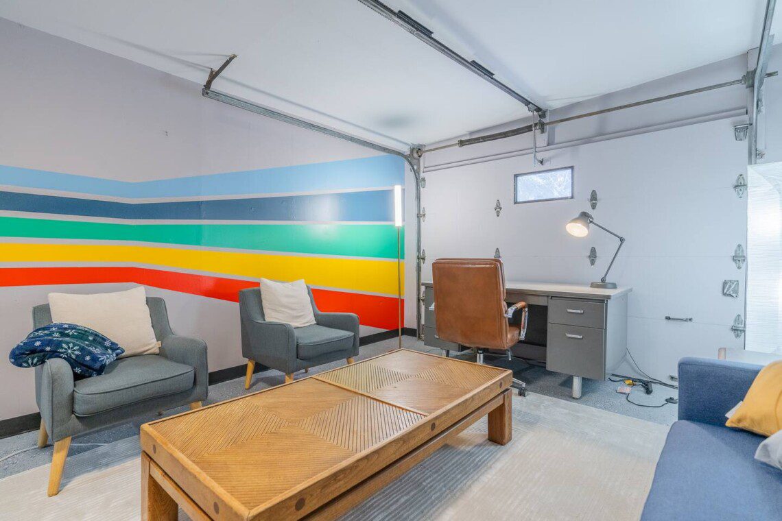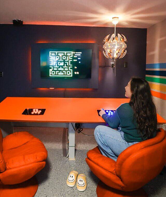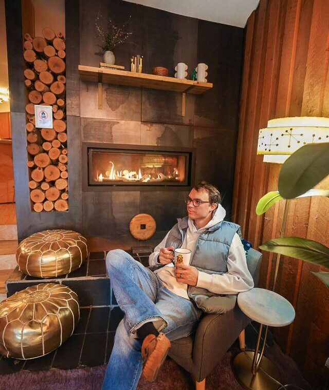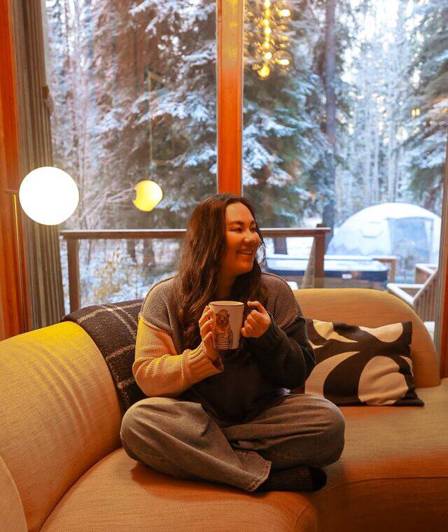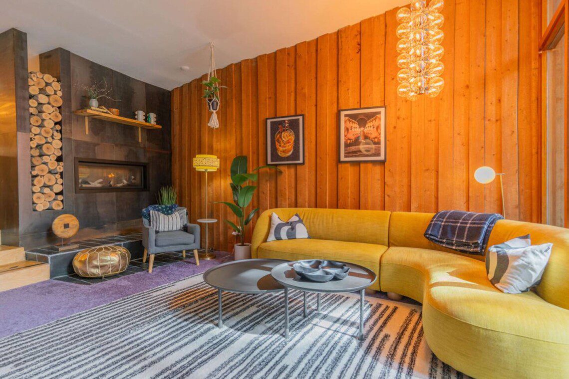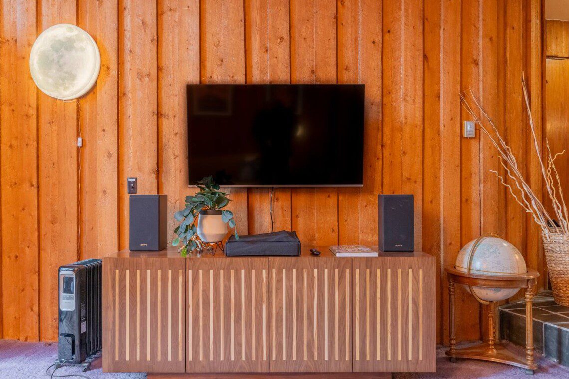 Upon entry, you’ll be greeted by the warm wood accents and soaring ceilings that define our spacious open living plan. The sunken living room, featuring expansive floor-to-ceiling windows accommodating nine guests, provides an unparalleled vantage point for experiencing the enchanting Aurora Borealis. Relax on our chic West Elm sectional couch while basking in the glow of a double-sided gas fireplace, creating a cozy atmosphere. Set the mood with your favorite tunes on our vintage record player or engage in a delightful game night for an authentic mid-century modern experience!