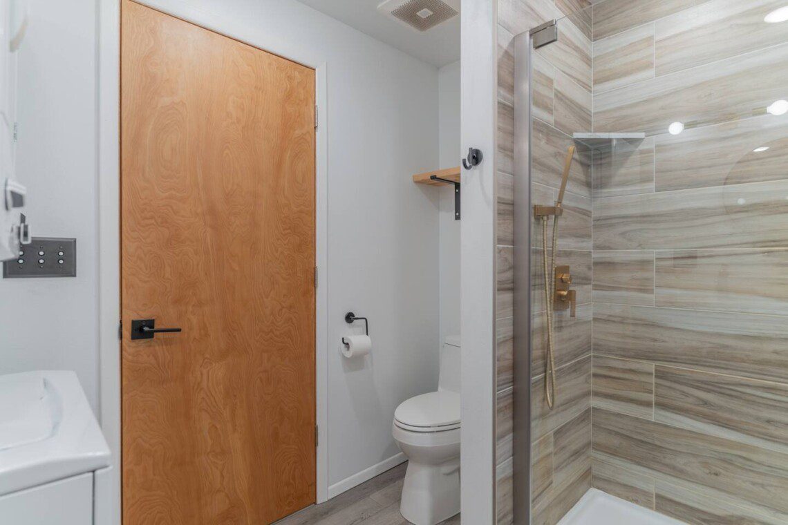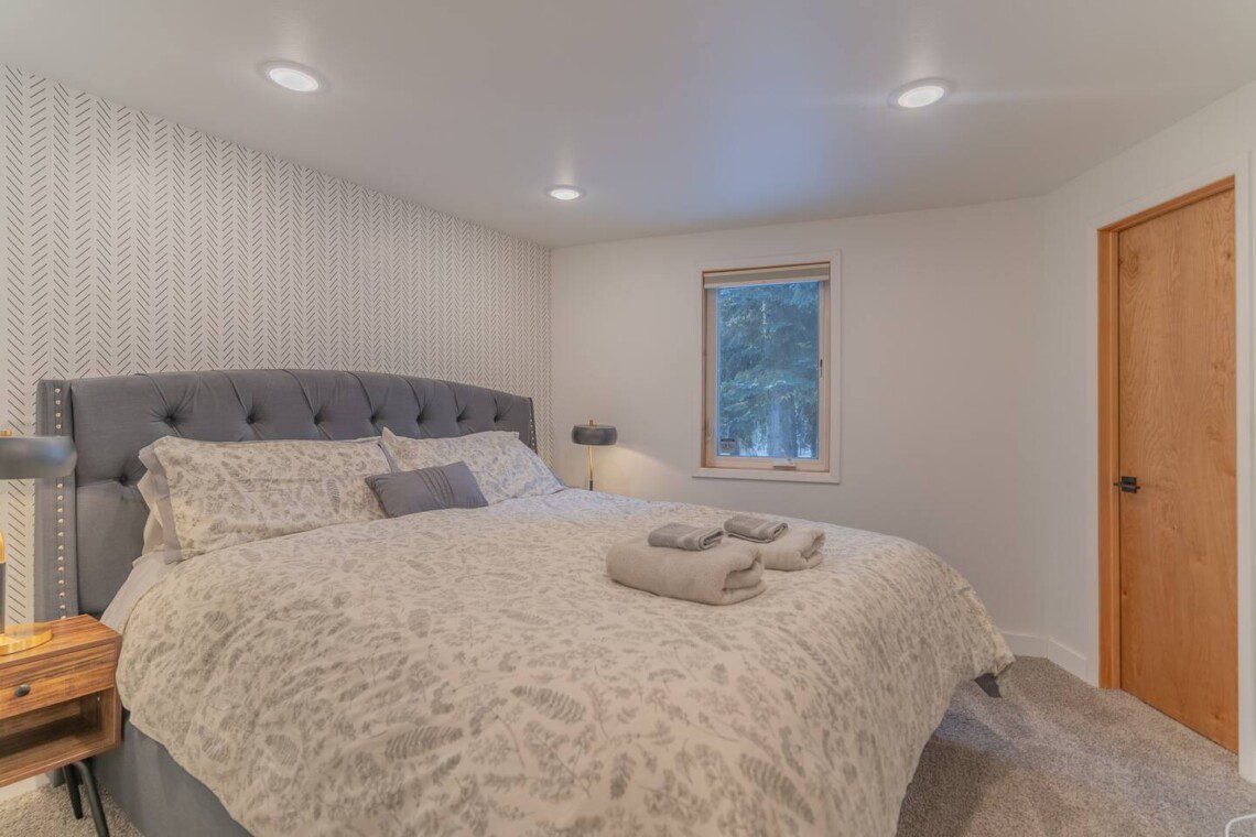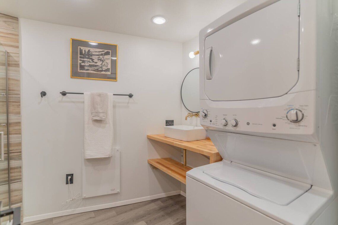 Behind the kitchen you’ll travel down the hallway to the two spacious bedrooms – the luxurious captain’s sleeping quarters with a king bed, and the first mate’s quarters with a queen bed – both with soft-as-can-be duvets for snuggling in after a long day of exploring all that the last frontier has to offer. In this wing you will also find our second bathroom with a luxurious rain shower and laundry machines available to use during your stay.
