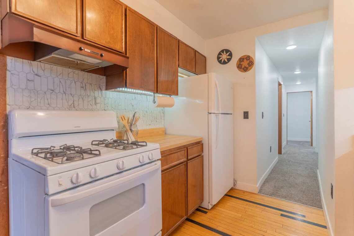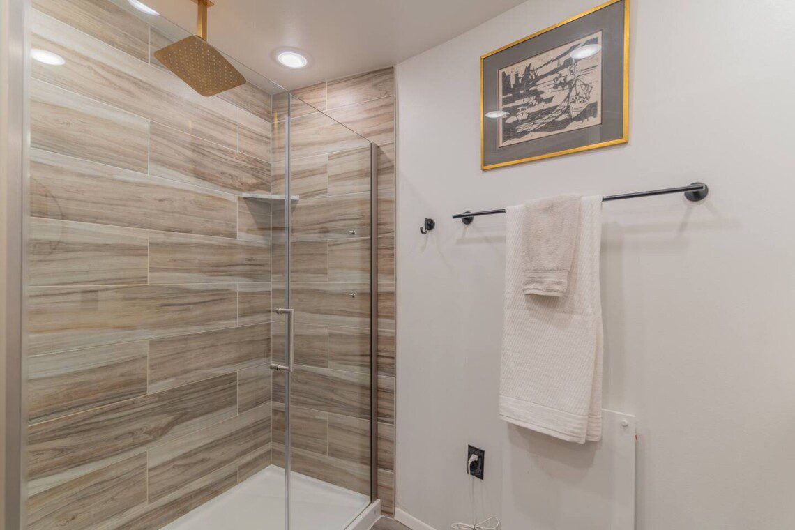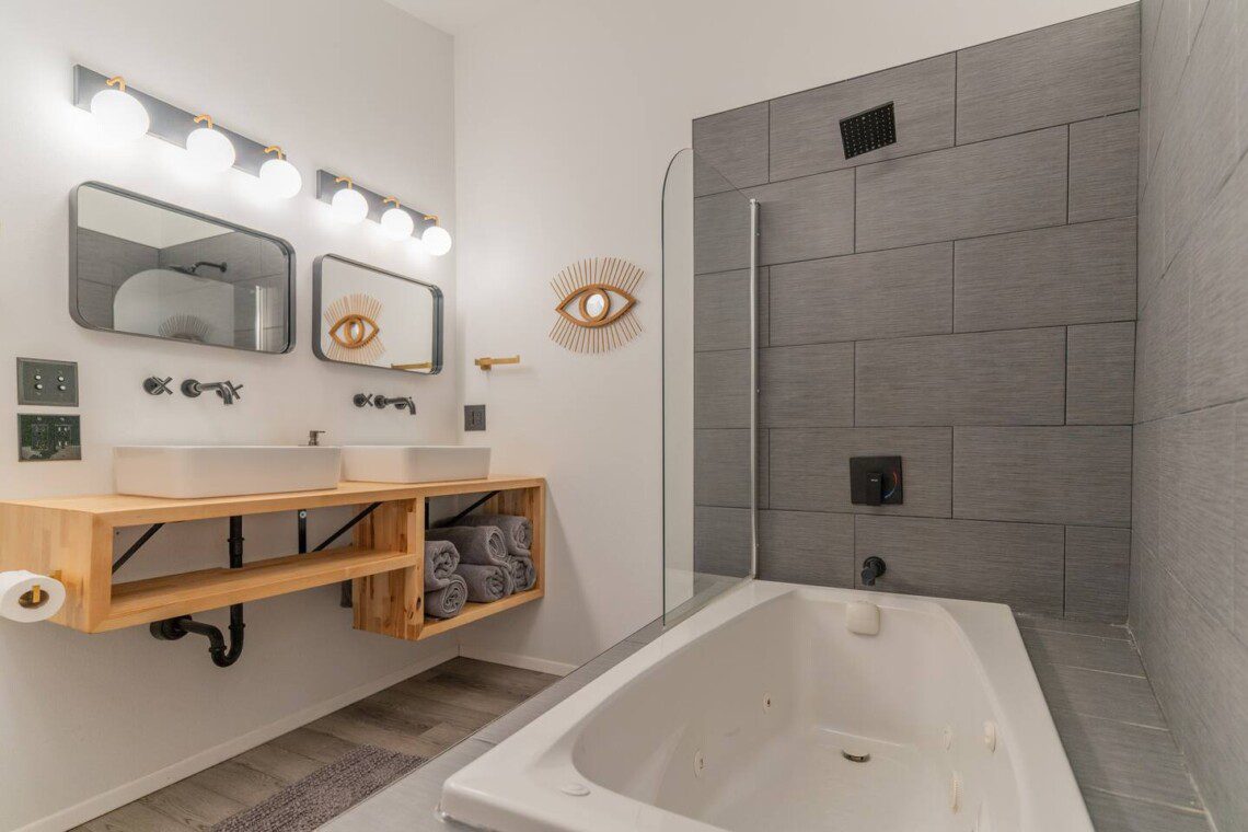 Down the hall from the kitchen you’ll find a brand-new luxury bathroom, with twin sinks and a shower and tub combo with striking gold and black accents.