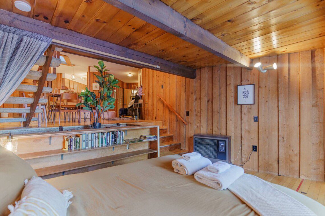 Across from the open dining area is a two-level sleeping and lounging area. Step down to a cozy den with a dreamy queen bed with access to your own private deck overlooking the forest. Step up to a spacious lounge sporting a king bed, soaring ceilings with stylish lighting and period artwork. Both spaces have privacy curtains that can be closed at night.