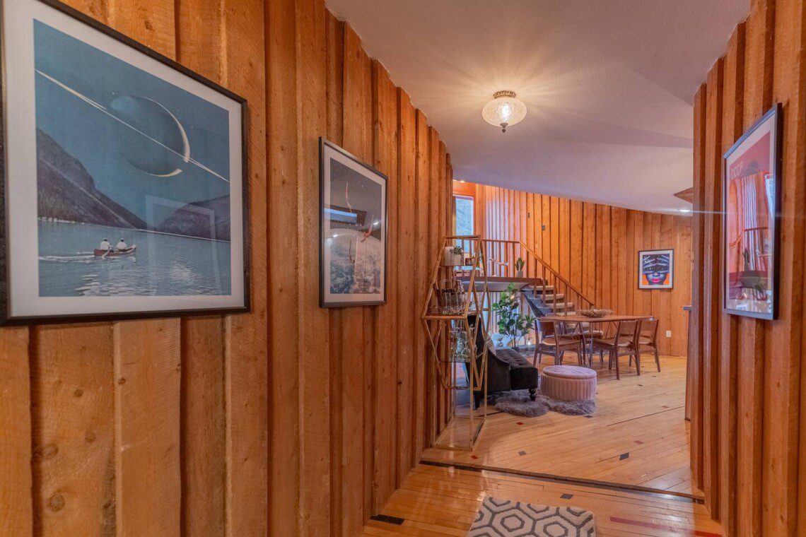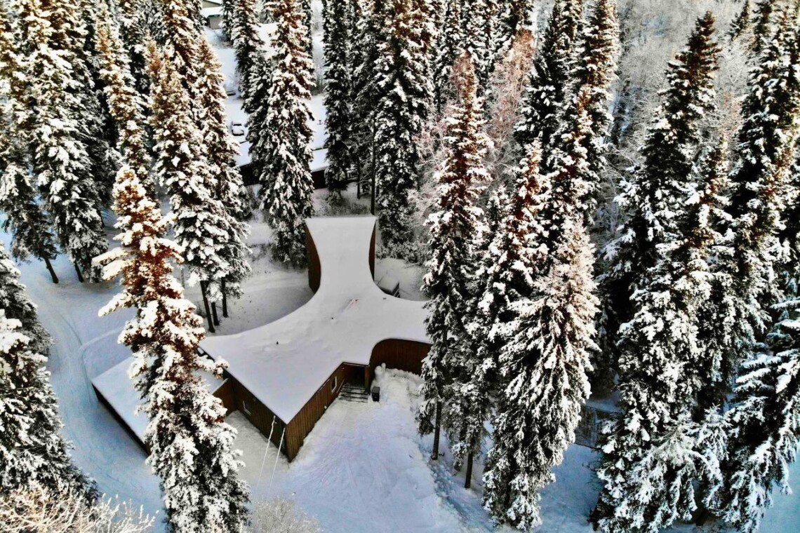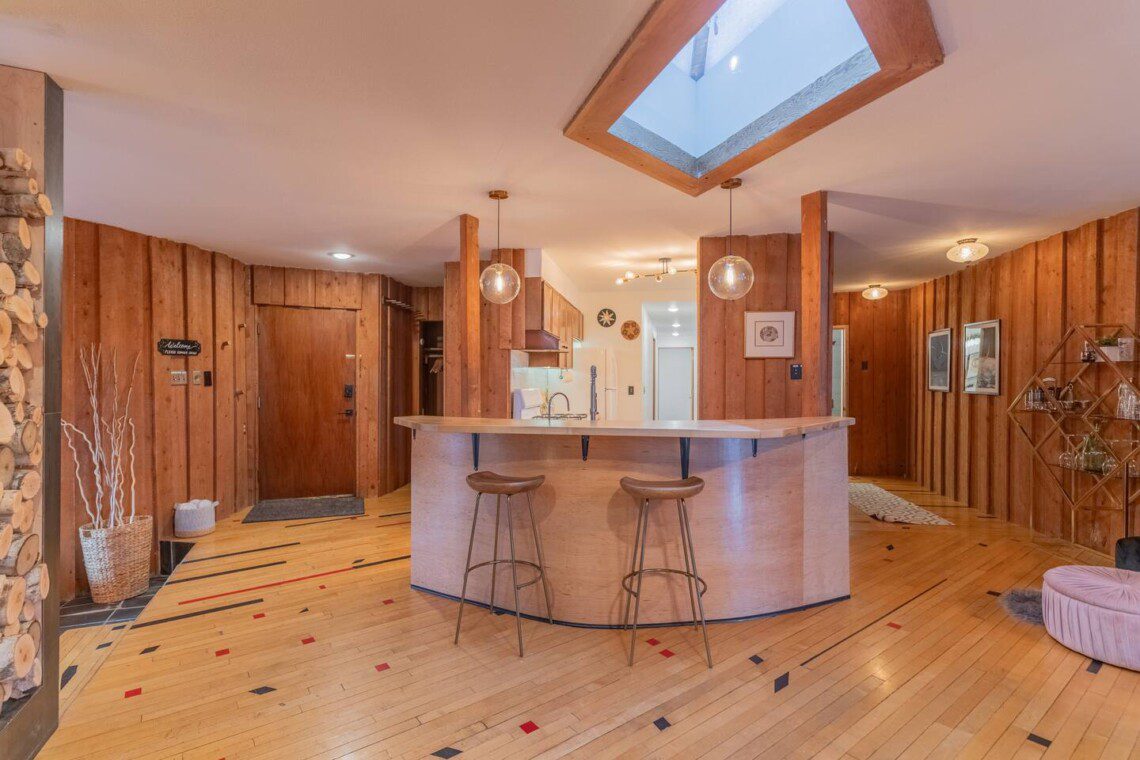 Step into the Star Base and immerse yourself in the inviting ambiance of a meticulously crafted mid-century modern home! This exceptional residence, a bespoke creation by architect Roger Cotting in 1965, takes the form of a star, epitomizing the mid-century modern aesthetic. Inside, the central focal point is the kitchen, serving as the heart of the home, with multiple wings extending outward. The stunning hardwood floors have been artfully repurposed from a local Fairbanks school gymnasium, bearing witness to their history through the faint traces of basketball court paint.