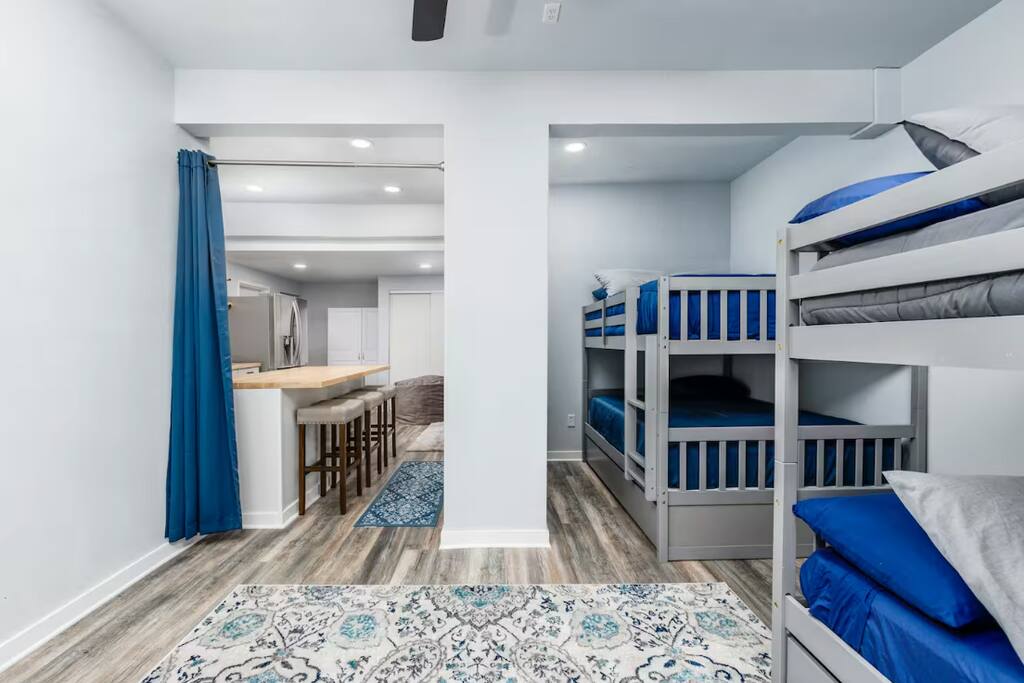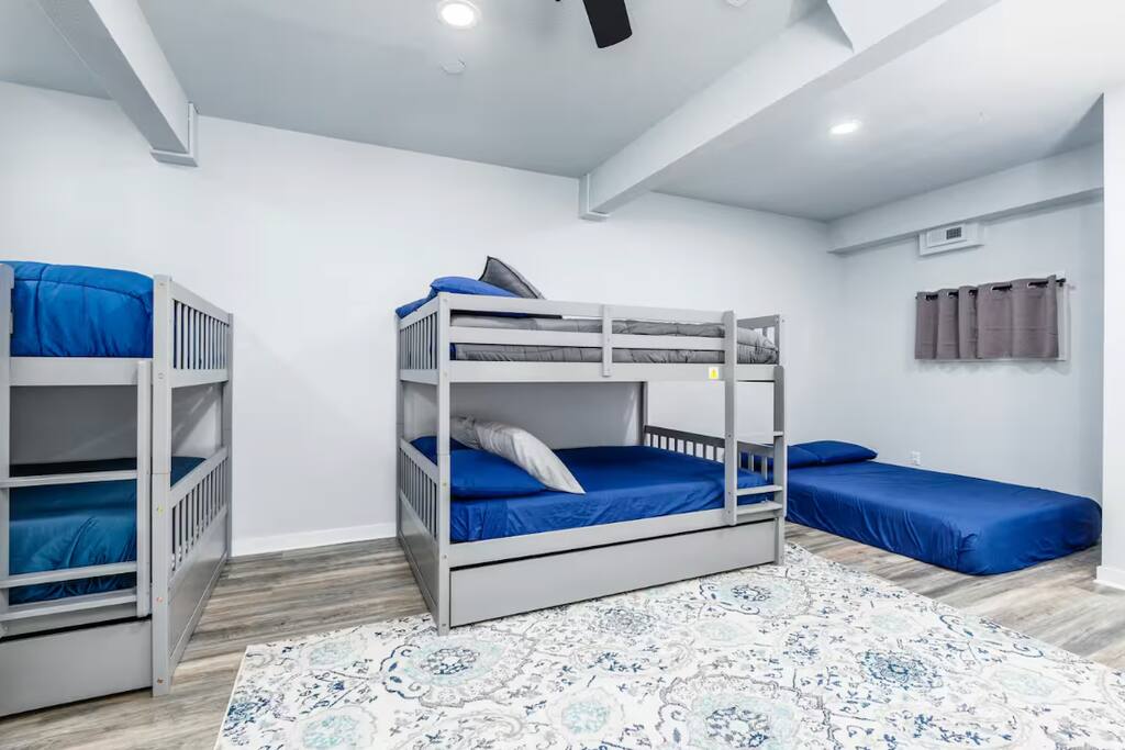 Four additional bedrooms each include a bunk setup with a double bed on the bottom and a twin bed on the top. These rooms work wonderfully for siblings, cousins, teens, teammates, or friend groups who enjoy staying close while still having their own mattress and personal space.