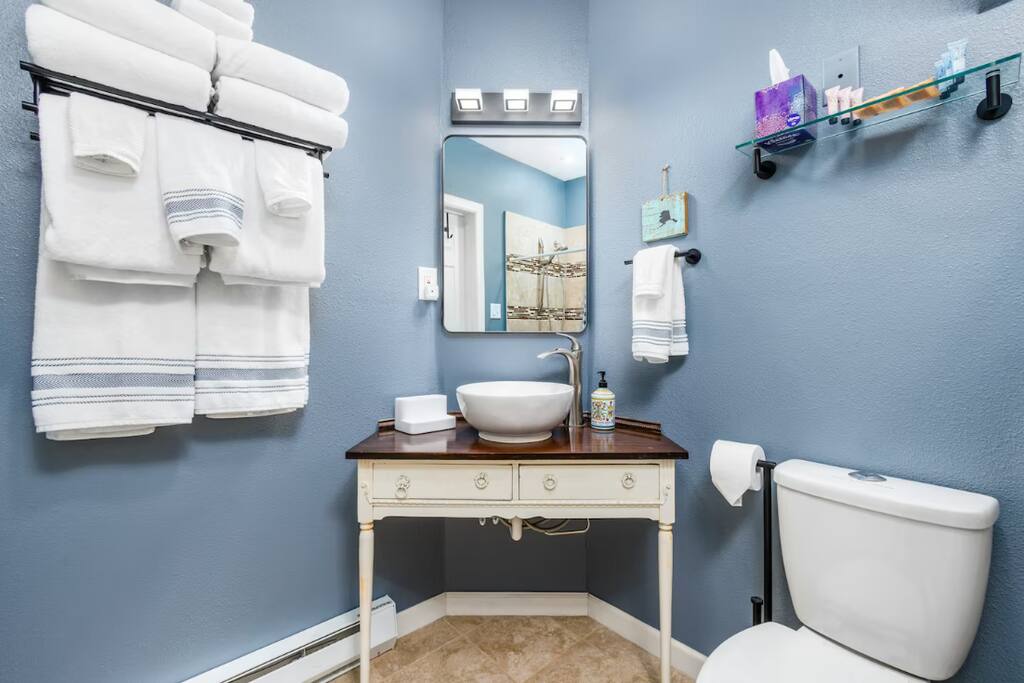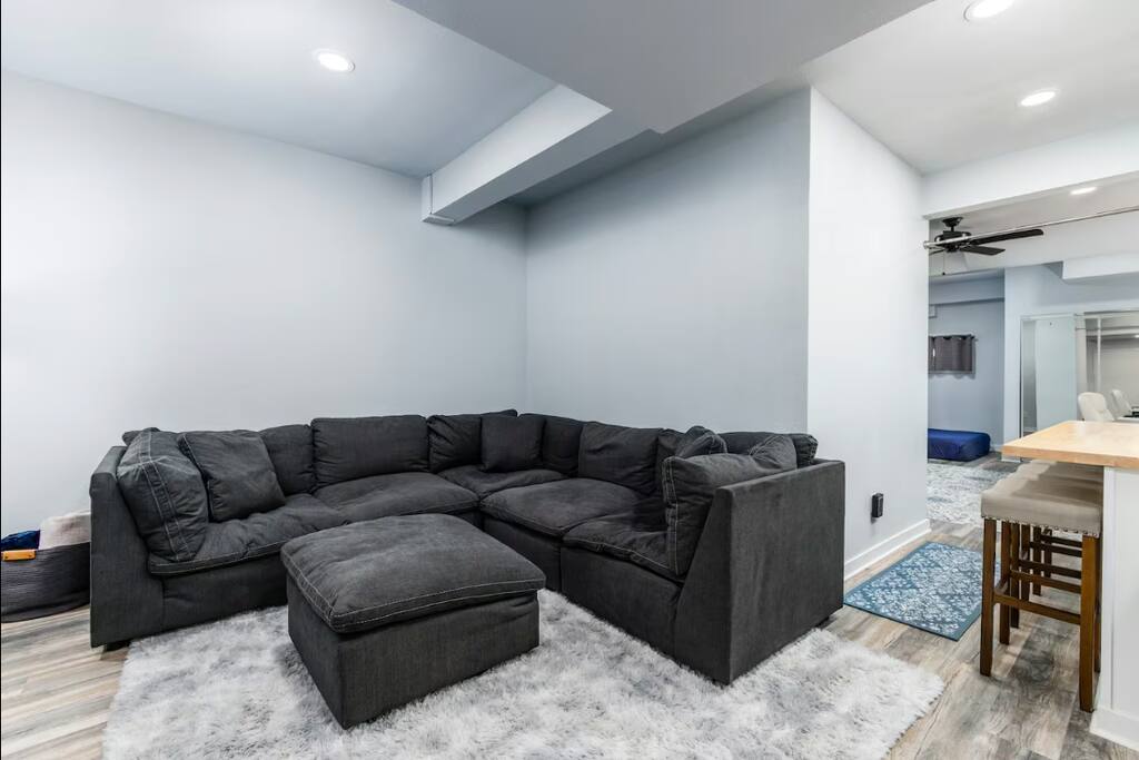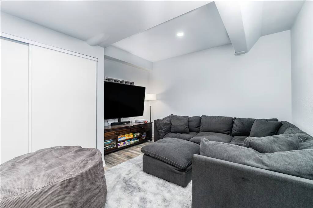 The lower level features a spacious basement suite that feels like its own living area. Inside are a queen bed and two additional bunk beds, making it a very flexible zone for families, younger groups, mixed age travel, or anyone who wants a separate hangout area. Two living areas, private bathrooms, and multiple sleep zones mean everyone has their own place to settle and mornings are easier because no one is sleeping on a couch or temporary setup.