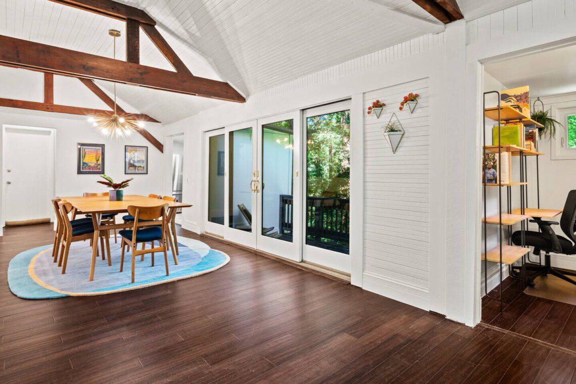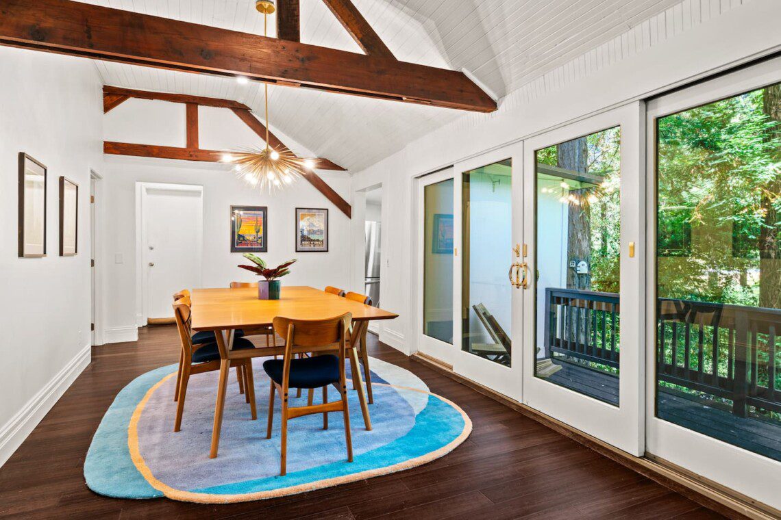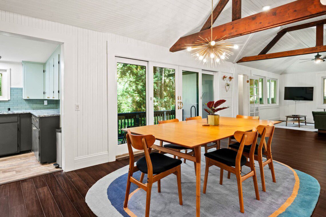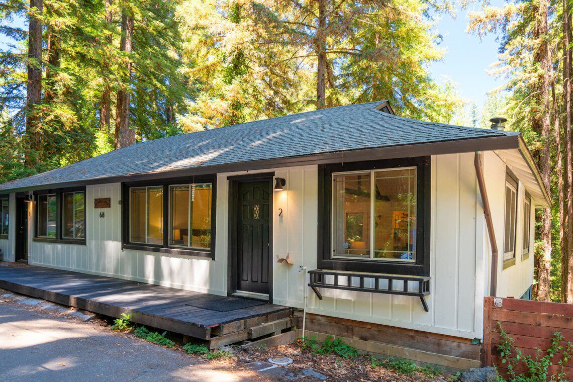 Wake up beneath cathedral-high redwood ceilings in a former church, now a light-filled midcentury retreat surrounded by towering trees. With forest views in every room, a dedicated office, and fast Wi-Fi, this is your space to work deeply or truly unplug. Recently renovated with style and soul, it’s quiet, spacious, and close to the best of Sonoma County—wineries, wild coastlines, and redwood hikes. Whether you’re escaping, creating, or relocating, you’ll find sanctuary here. Live, work, and breathe among the redwoods in this one-of-a-kind midcentury sanctuary. Originally built in 1924 as St. Rita’s Catholic Church, the home now blends original character with modern comforts. The construction of the church dates to the railroad era, when weekenders from San Francisco rode the North Pacific Coast line to Camp Meeker and beyond – part of the “Redwood Empire” resort boom that followed the logging days. Today, it’s a fully renovated 2-bedroom home with soaring ceilings, forest views from every room, and the kind of silence you forget you needed.
