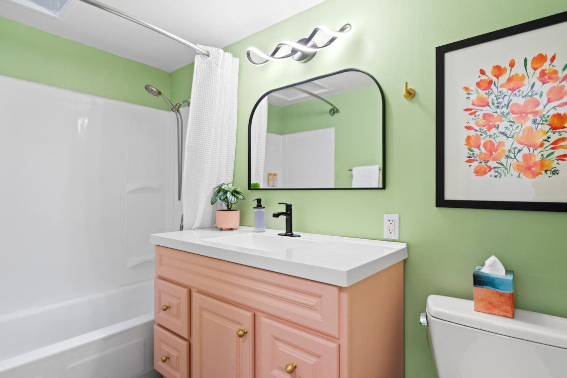 The home includes two peaceful bedrooms with plush beds, ample storage, and soft natural light. The bathroom is stocked with fresh towels and essentials to help you feel pampered throughout your stay.